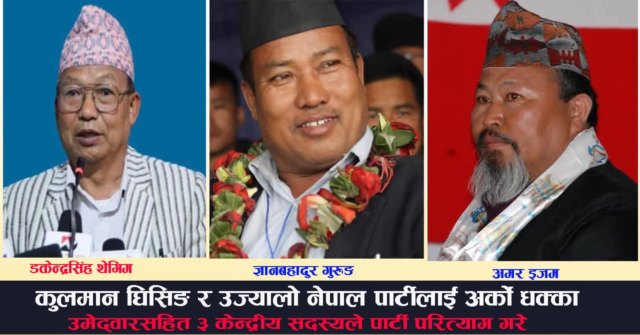 मोरङ । कुलमान घिसिंङ नेतृन्वको उज्यालो नेपाल पार्टीको समानुपातिक उमेद्वारसहित ३ जनाले पार्टी परित्याग गरेका छन् ।यसरी राजिनामा दिनेहरुमा पहिचानवादी नेता डकेन्द्रसिंह थेगिम, ज्ञानबहादुर गुरुङ र अमर इजम रहेका छन् ।तीनै जना पार्टीको केन्द्रीय सदस्यहुन् । तीन जनाले आज (माघ ८) संयुक्त विज्ञप्ति जारी गर्दै उज्यालो नेपाल पार्टीको साधारण सदस्यसमेत